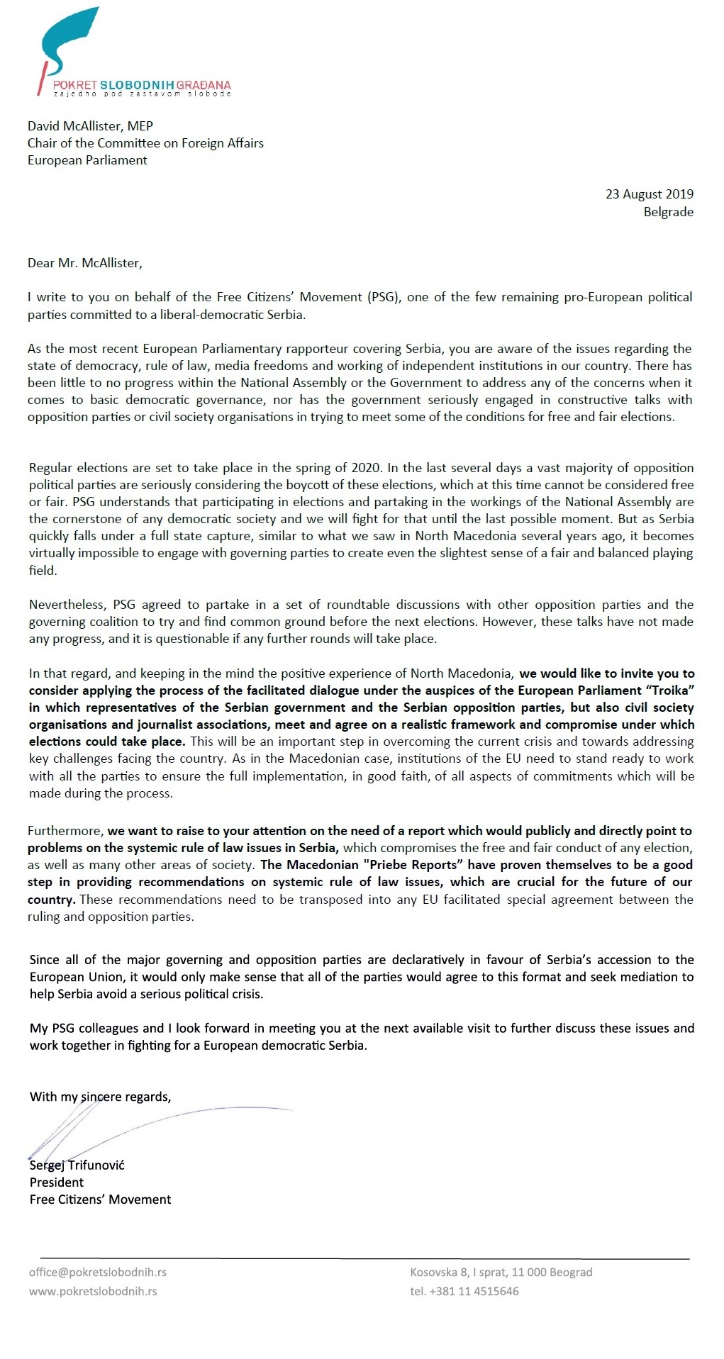 Sergej Trifunović, predsednik Pokreta slobodnih građana, obratio se otvorenim pismom Dejvidu Mekalisteru, predsedniku Odbora za spoljne poslove Evropskog parlamenta, u kom ga je pozvao da organizuje dijalog pod patronatom Evropske unije u kom bi predstavnici vlasti i opozicije iz Srbije, kao i civilno društvo i novinarska udruženja došli do dogovora o realnom okviru u kom bi se održali izbori 2020. godine.