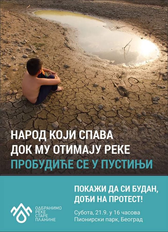 Pokret slobodnih građana poziva sve nepokorene i slobodne građane da se priključe velikom Ekološkom protestu protiv minihidroelektrana, u subotu 21. septembra, u Pionirskom parku, u Beogradu, u 16 časova, kao i Velikom narodnom zboru, 29. septembra, u selu Topli Do, u parku prirode na Staroj planini.